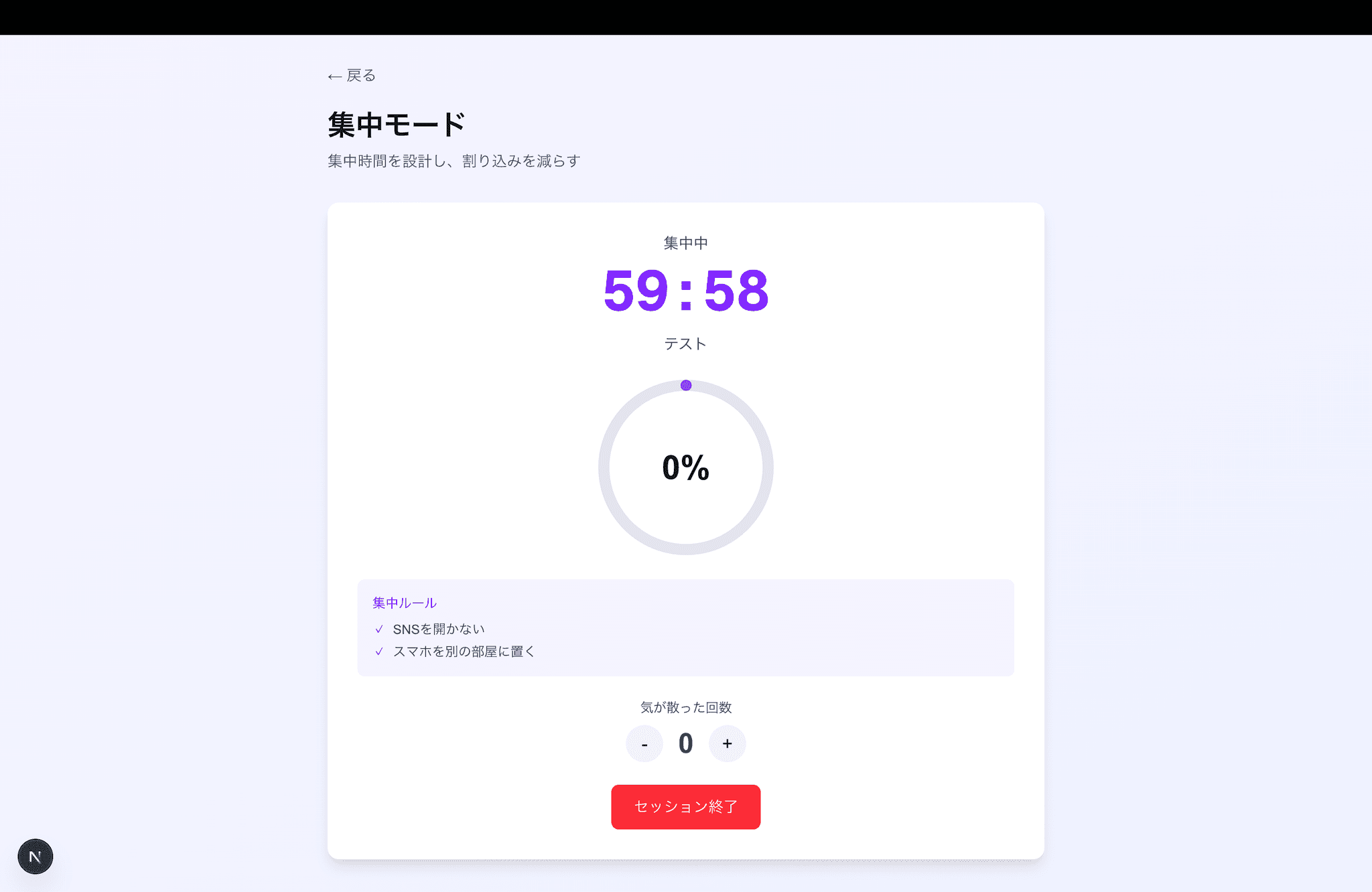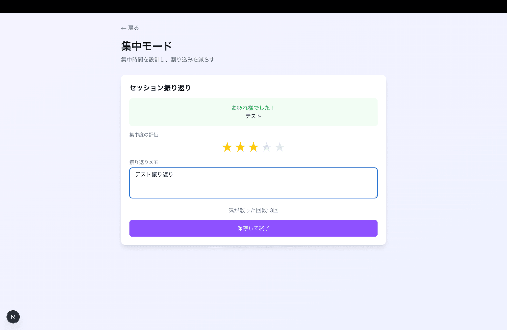 集中時間を設計し、割り込みを減らすセッション管理。集中セッション設定、通知の抑制ガイド、終了時の振り返りログ機能。