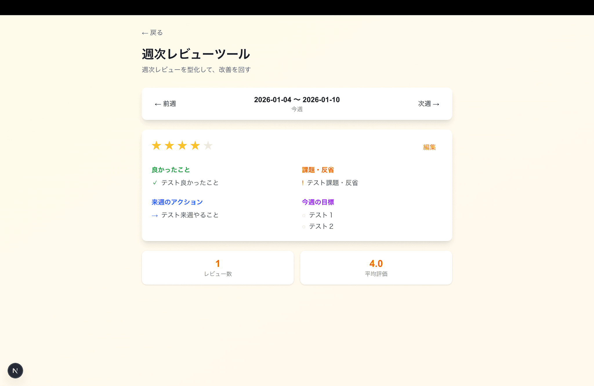 週次レビューを型化して、改善を回すツール。週次テンプレ(良かった/課題/次週)、目標との紐付け、レビュー履歴の比較機能。