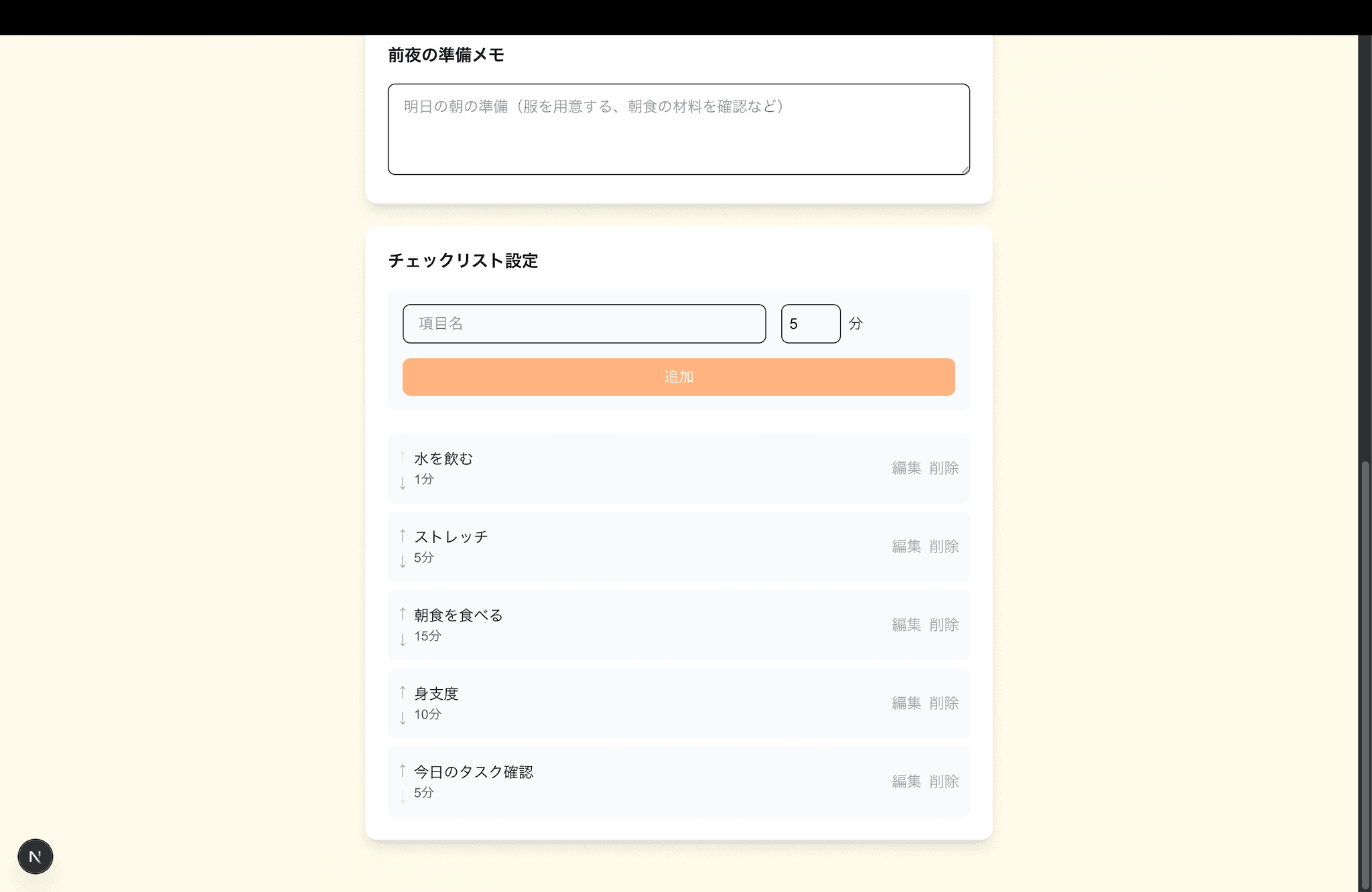 朝のルーティンをチェックリスト化して継続する。朝活チェックリスト(順序/所要)、達成率と連続記録、前夜の準備メモ機能。