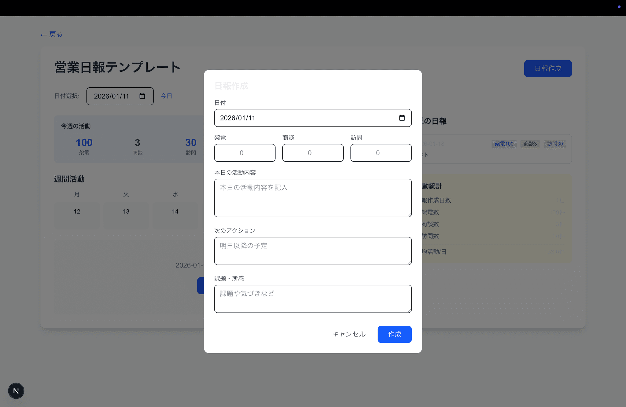 日報入力テンプレ、活動量集計ができる営業日報アプリ。日報作成・編集・削除、活動記録(架電・商談・訪問件数)、週間/月間サマリー対応。