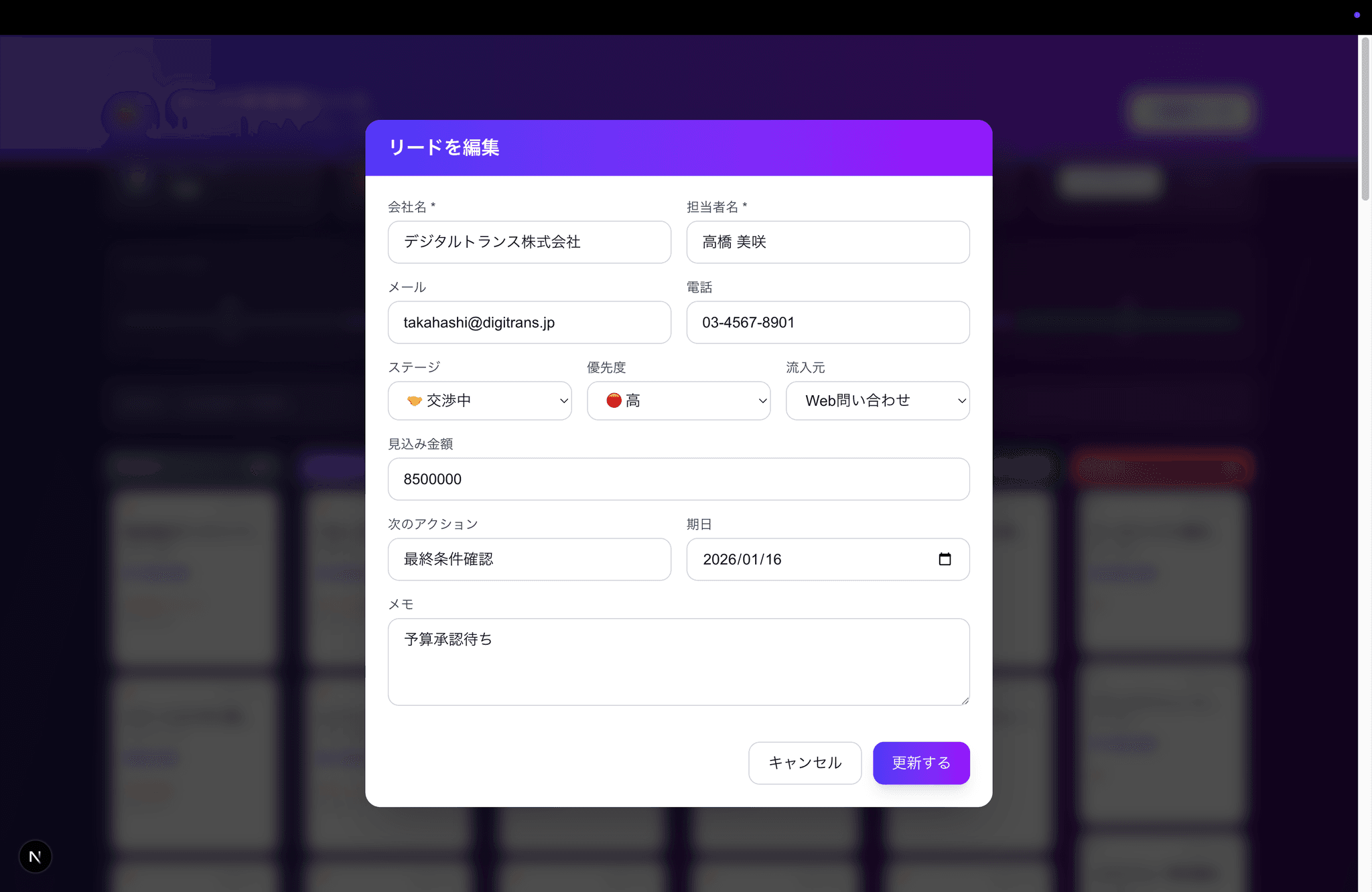 パイプラインで案件を可視化・管理するCRMツール。6ステージのカンバンビュー、優先度・流入元管理、セールスファネル可視化、成約率レポート機能付き。