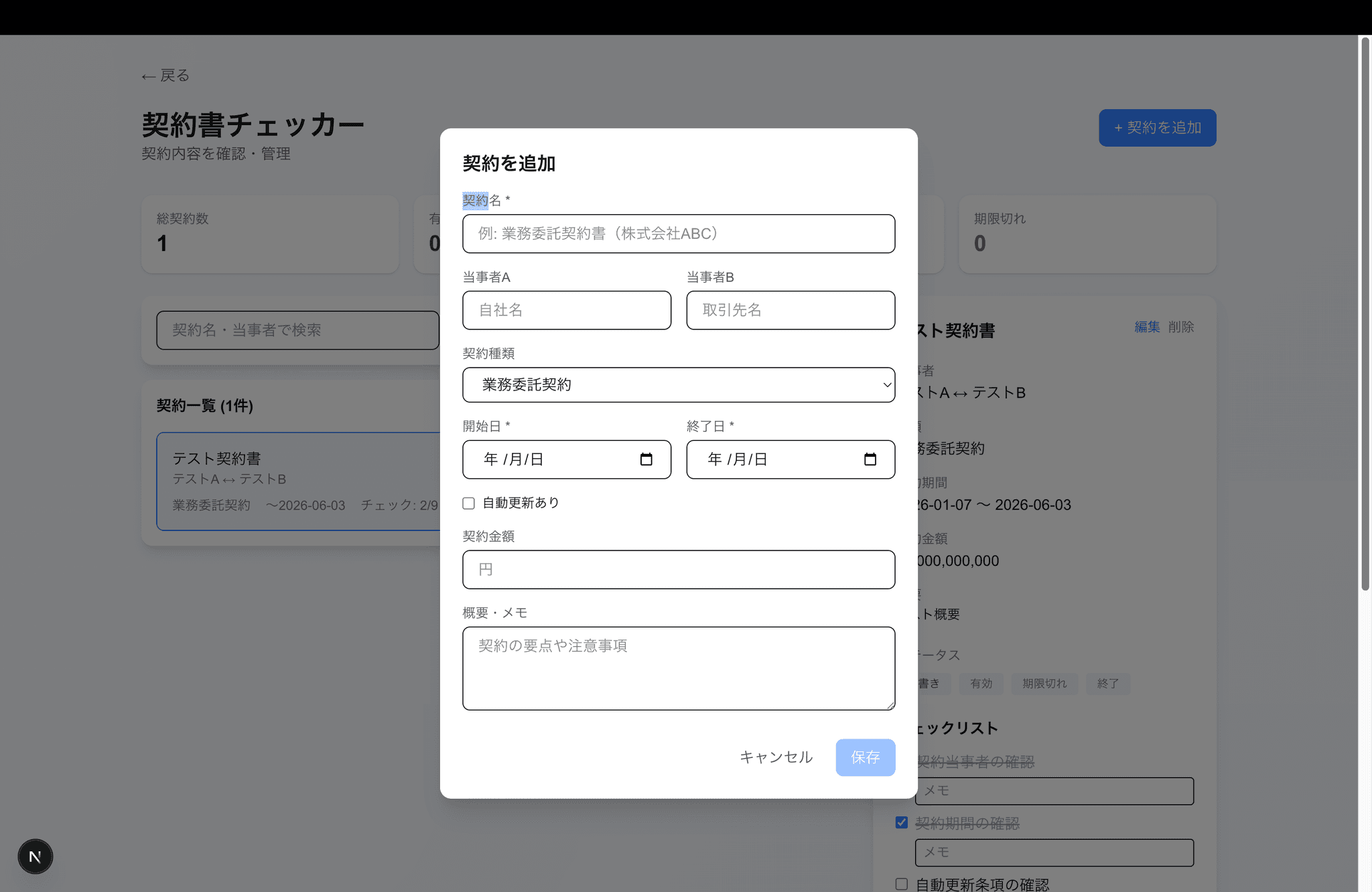 契約書の重要項目をチェックリストで管理するツール。契約書登録・ステータス管理、チェック項目のカスタマイズ、期限アラート・更新履歴機能付き。