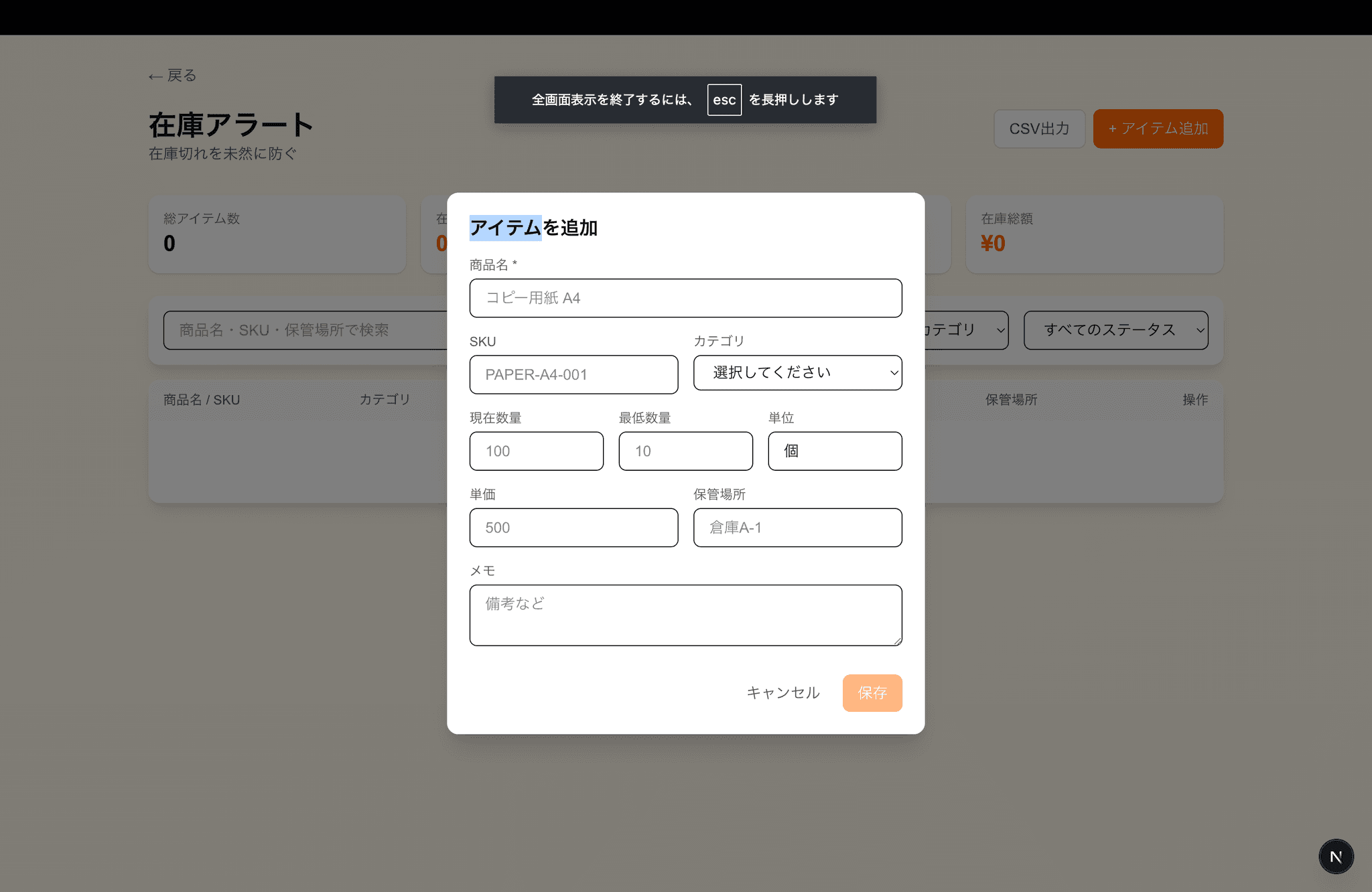 在庫の閾値を超えたら通知するアラート。商品登録、在庫数管理、閾値設定、アラート履歴機能付き。