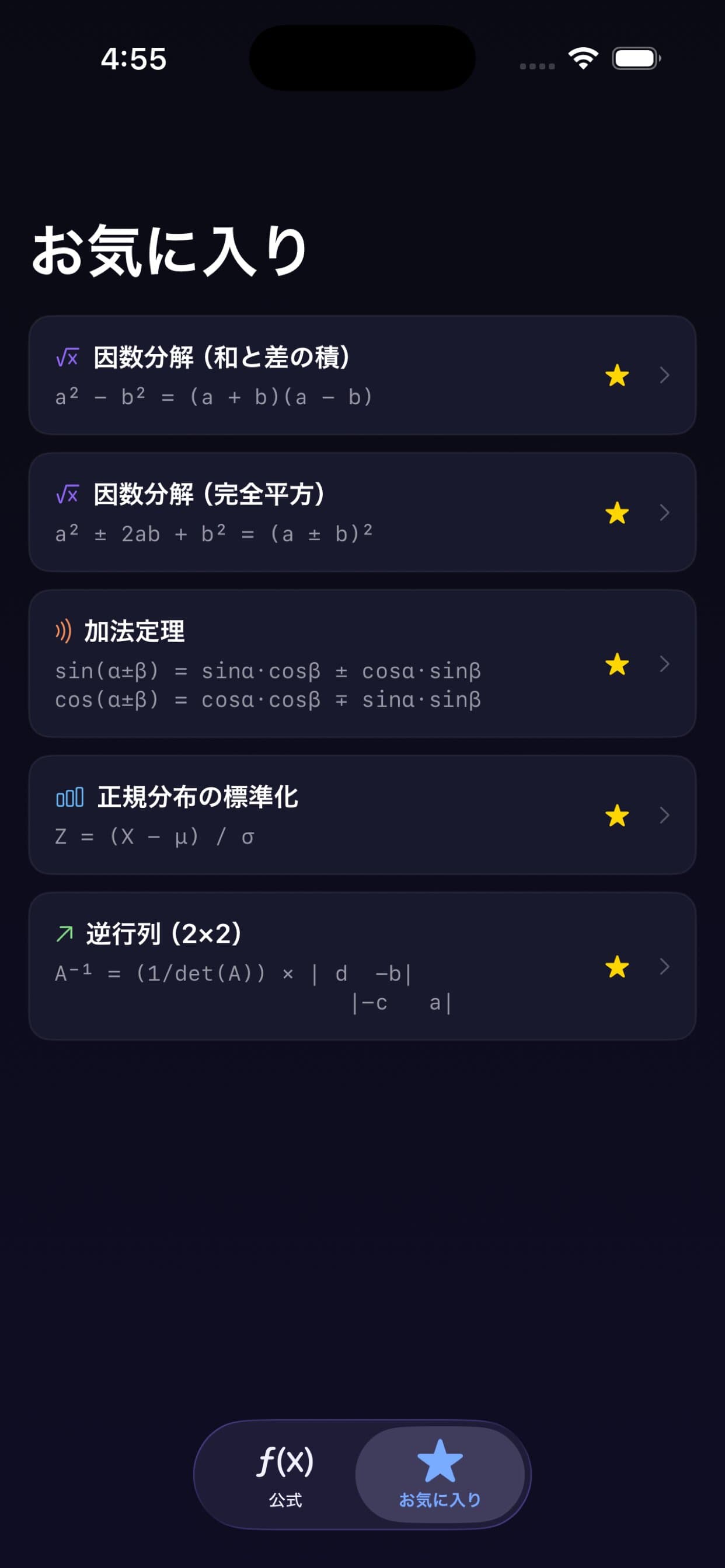 App Store公開中の数学公式リファレンスアプリのソースコード。65公式収録。コンテンツ差し替えで他ジャンルにも転用可能。