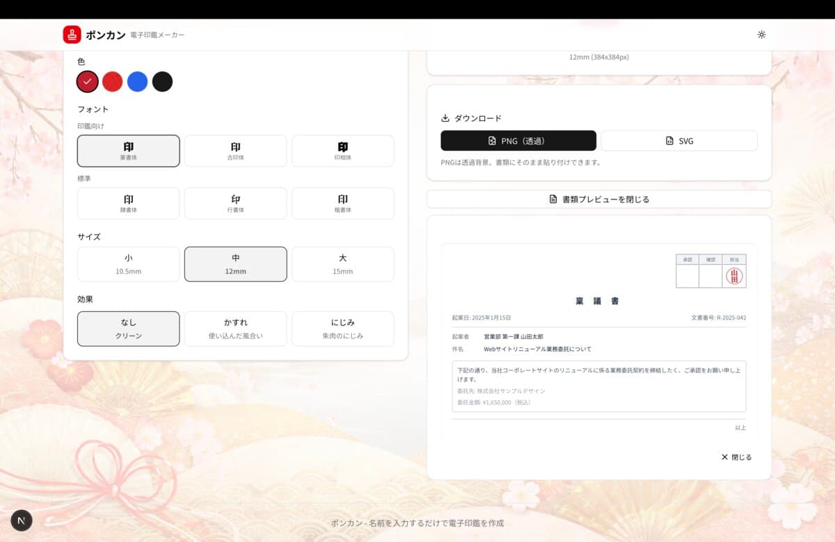 丸印・角印・日付印の3種類に対応。篆書体や古印体など本格的な印鑑フォントを搭載し、かすれ・にじみエフェクトでリアルな仕上がりを実現します。透過PNG / SVGでダウンロード可能。