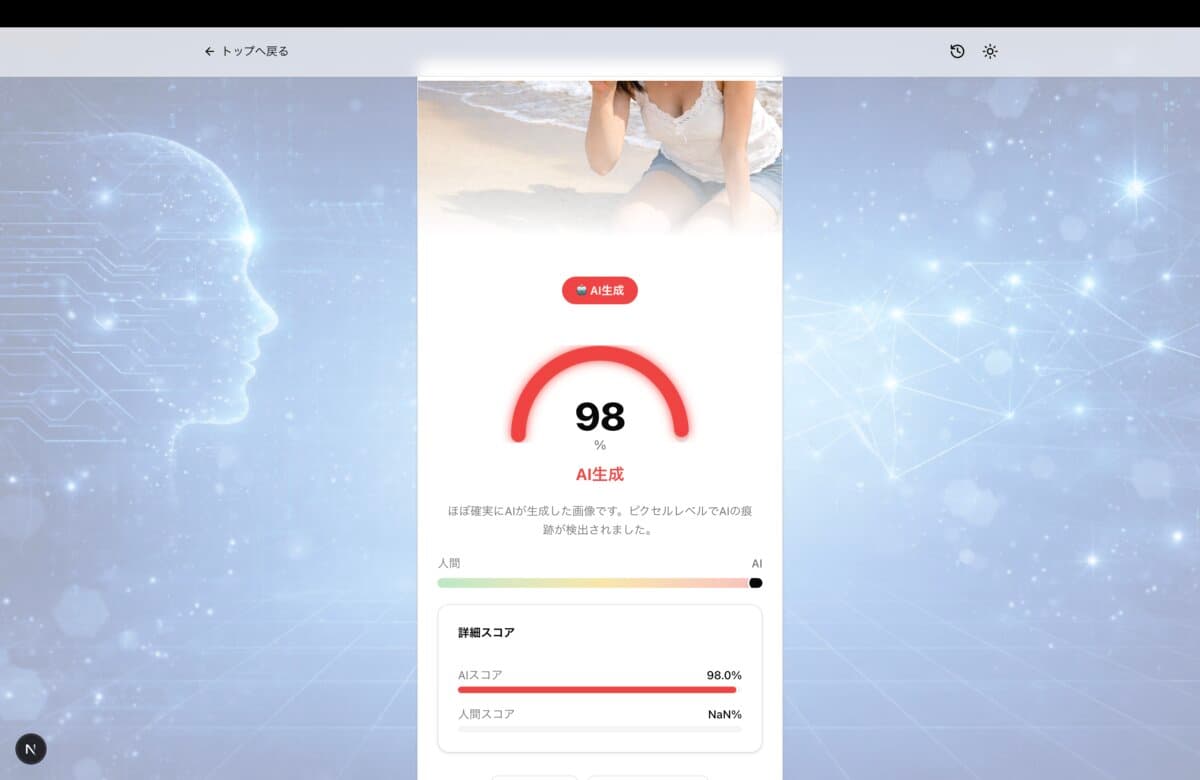画像がAI生成か人間作成かを判定するWebツール。Sightengine API連携、5段階ラベル・スコア可視化・分析履歴搭載。