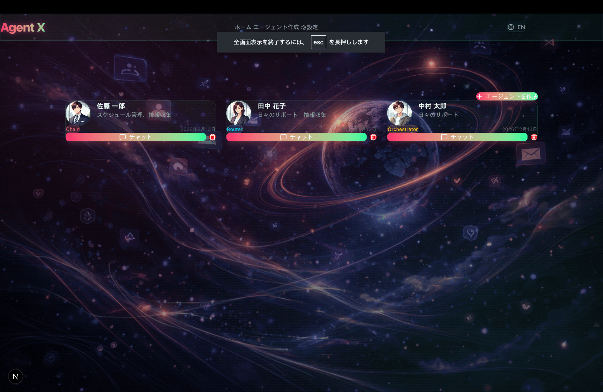 Agent Xは、カスタムAIエージェントの作成・管理・チャットを一つのプラットフォームで完結できるWebアプリケーションです。3ステップのウィザードで直感的にエージェントを構築し、5つの高度な実行パターンから最適な処理方式を選択。サイバーパンク風のUIデザインで、没入感のあるAI体験を提供します。