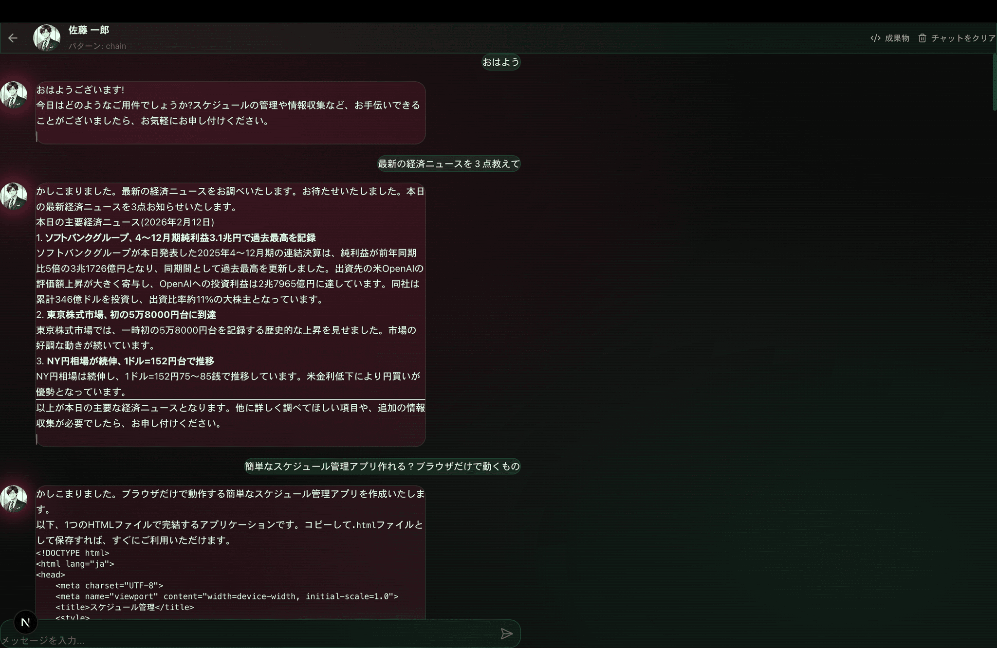 Server-Sent Events(SSE)によるリアルタイムストリーミングで、AIの回答をタイピングアニメーション付きで表示。Markdownレンダリング対応で、コードブロック、テーブル、リストなども美しく表示されます。