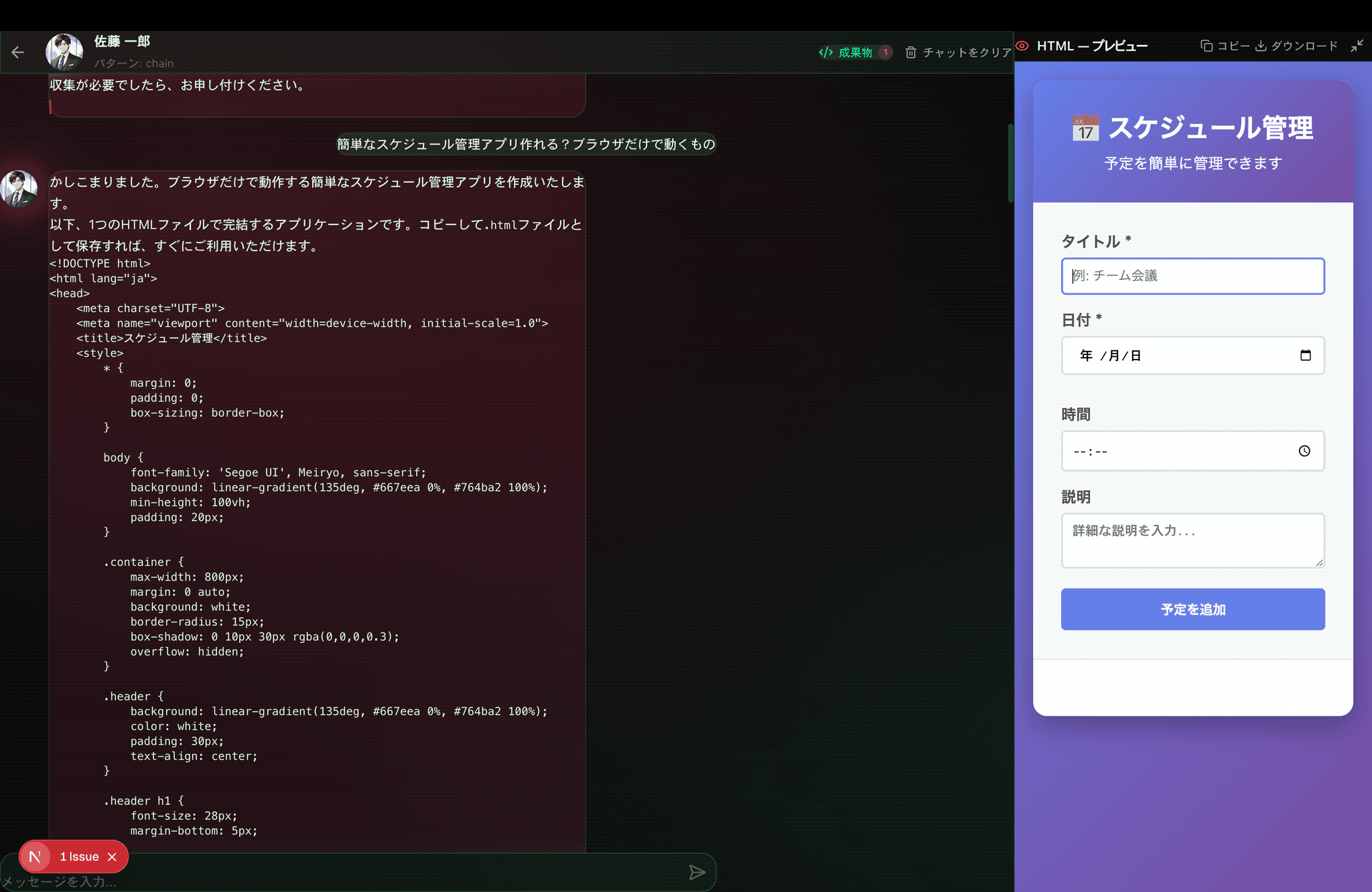 チャット内で生成されたコードブロックを自動抽出し、サイドパネルで一覧表示。50以上のプログラミング言語に対応し、ワンクリックでコピー&ダウンロード。HTMLアーティファクトはiframeでライブプレビュー可能。全画面拡大表示にも対応し、生成されたWebアプリをその場で確認できます。