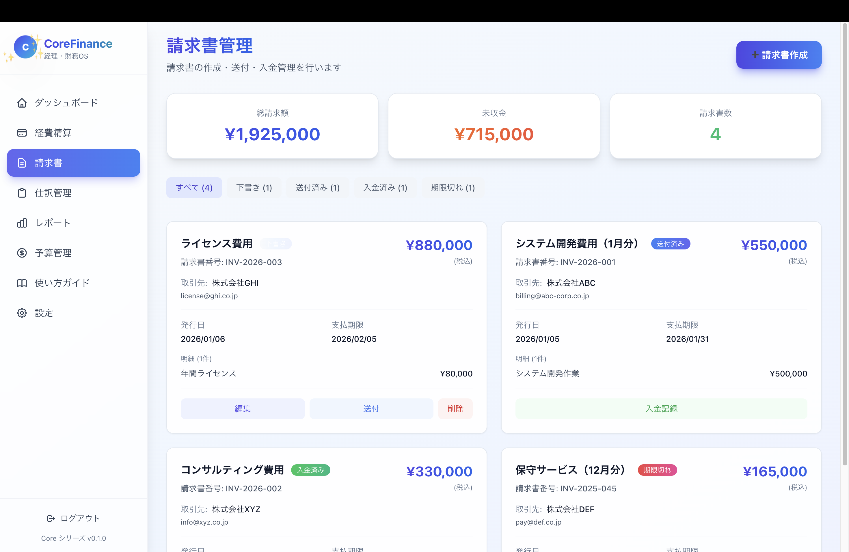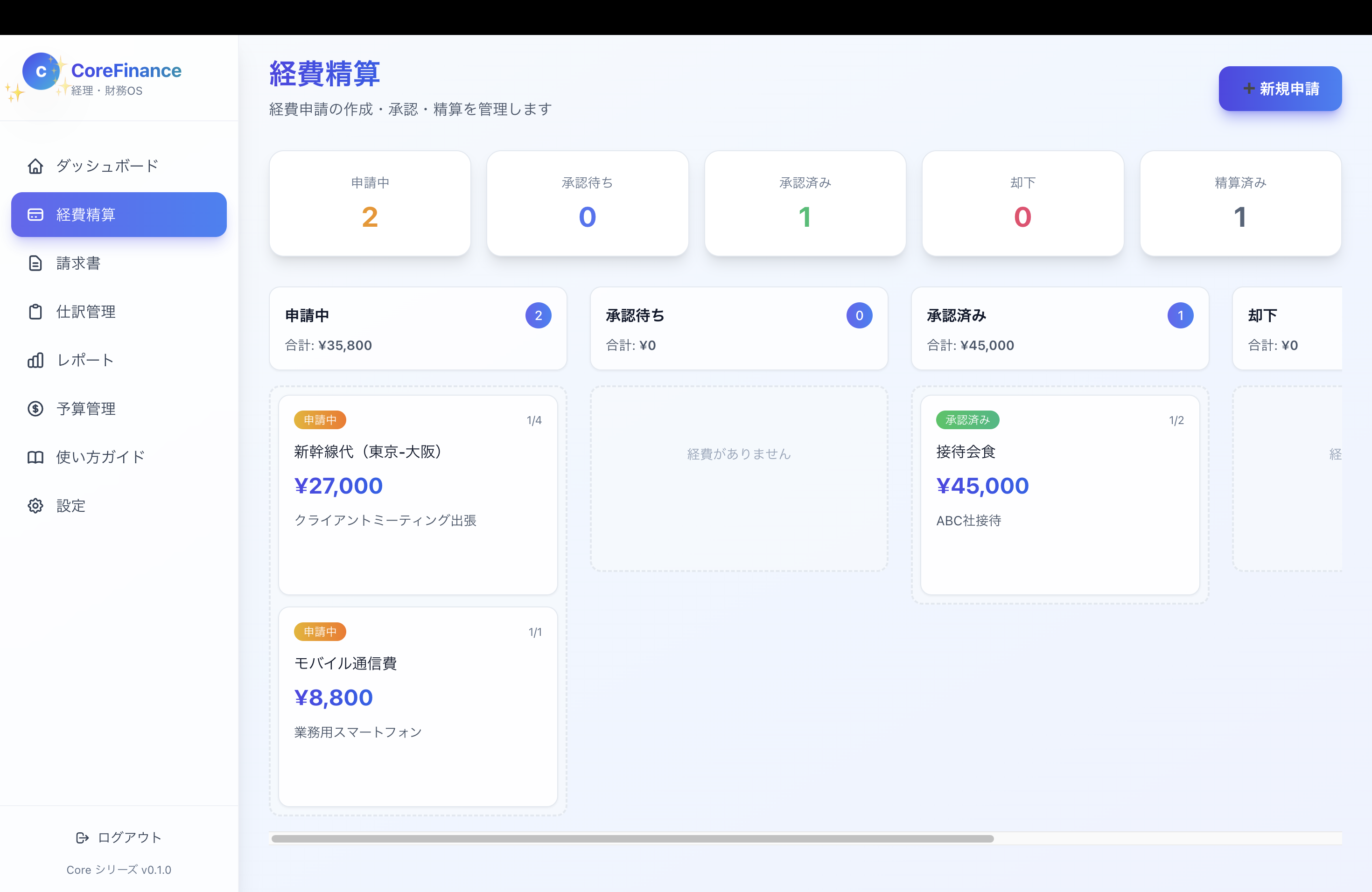 経費精算、請求書管理、仕訳処理、予算管理、財務レポートをワンストップで効率化します。