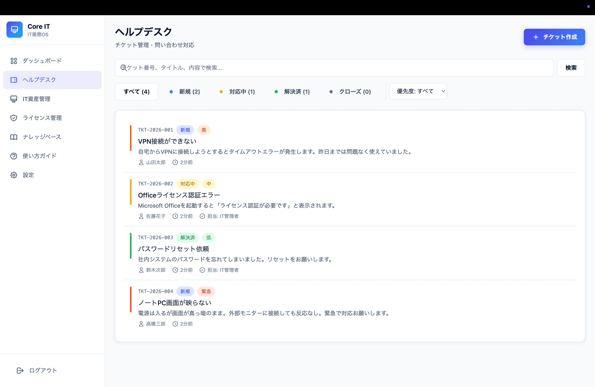 - ヘルプデスク(チケット管理、ステータス・優先度管理)