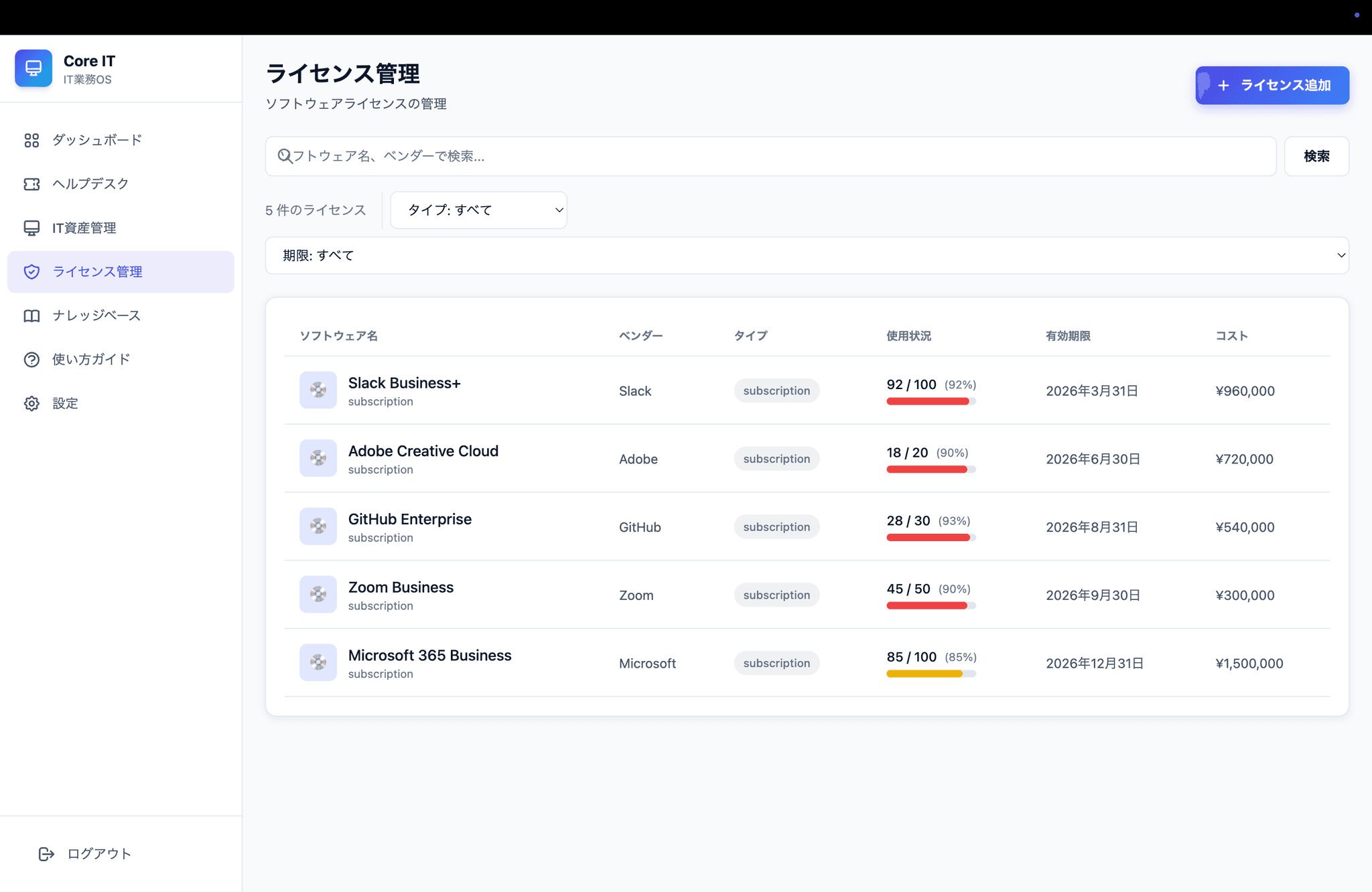 - ライセンス管理(使用状況トラッキング、有効期限アラート)