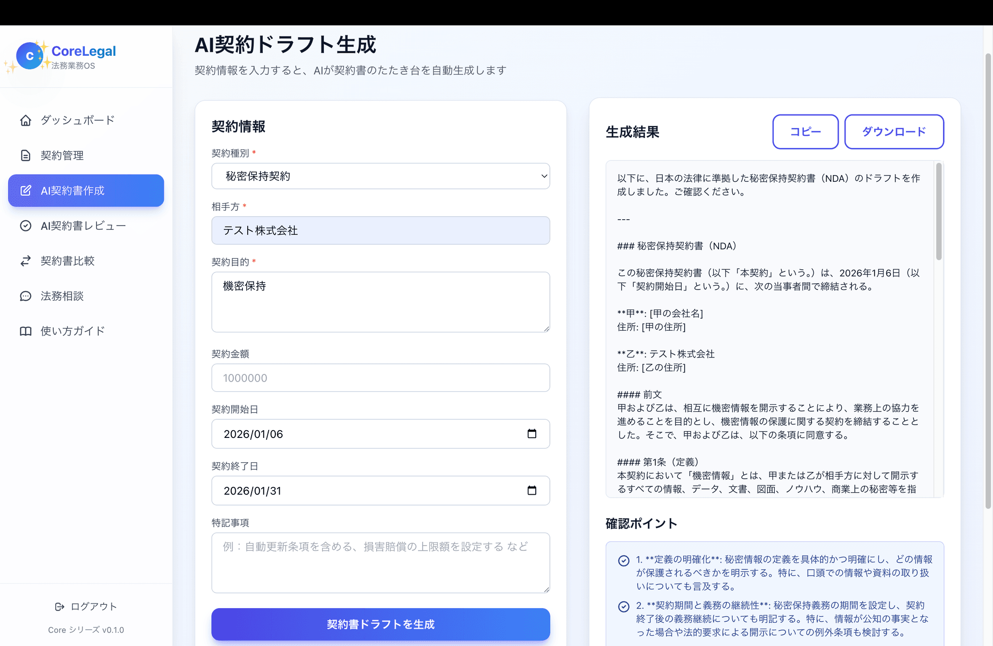 - 定型契約ドラフト生成(NDA、業務委託等)
