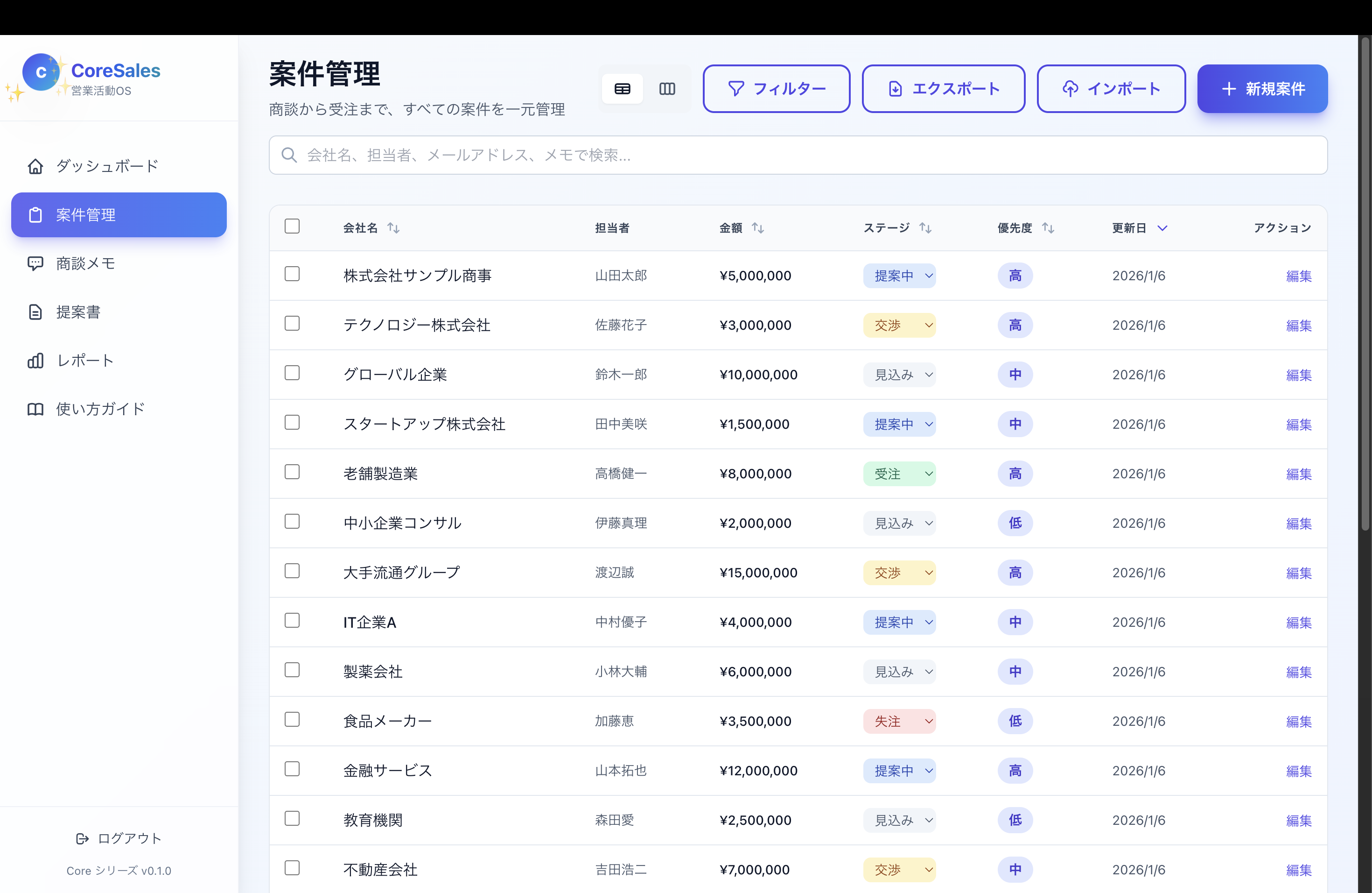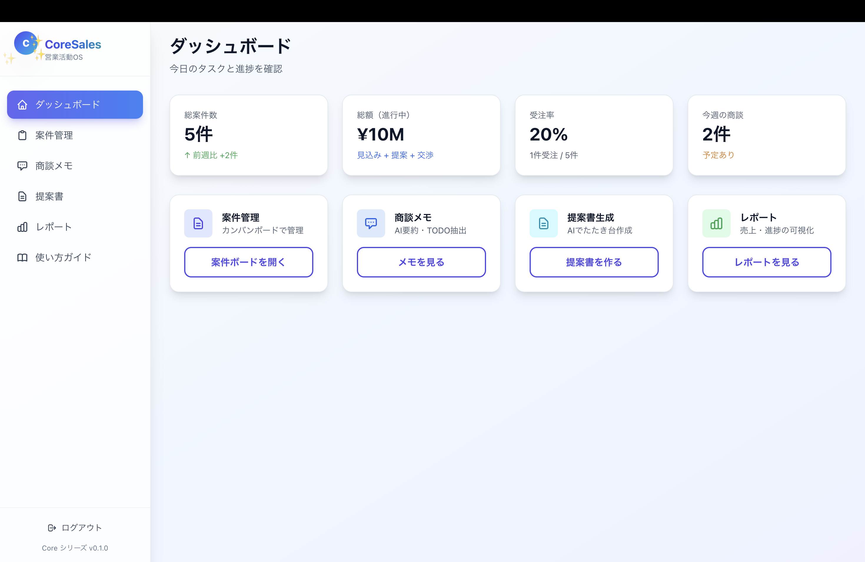 ## 概要 Core Salesは、営業活動をAIとワークフローで自動化・半自動化する業務OSです。 案件管理、商談メモ、提案書生成、レポート作成をワンストップで効率化します。 「営業活動を、AIがアシスト。」 ## ターゲット - 営業部門 - 営業マネージャー - 営業活動を効率化したい企業 ## 主要機能 - 案件管理ボード(カンバン形式、ドラッグ&ドロップ) - 商談メモ・要約機能(AI自動要約、TODO自動抽出) - 提案書生成(商談内容からたたき台生成) - レポート・ダッシュボード(日次・週次レポート自動生成) - 売上・パイプライン可視化 - 失注理由分析 ## 料金プラン | プラン | 月額 | 特徴 | |--------|------|------| | **Starter** | ¥49,800 | 基本機能 | | **Growth** | ¥119,800 | 中規模向け | | **Enterprise** | ¥300,000〜 | 大規模・連携強化 | ※初期費用:Starter ¥99,800 / Growth ¥198,000 / Enterprise ¥398,000〜 ※追加課金:ユーザー数帯+リード/案件数帯+連携(電話/MA/メール)