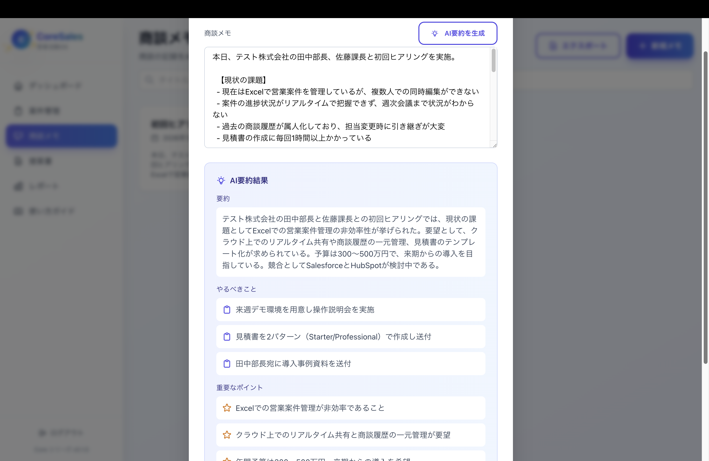 営業活動をAIで効率化。案件管理、商談メモ、提案書生成、レポートをワンストップで。