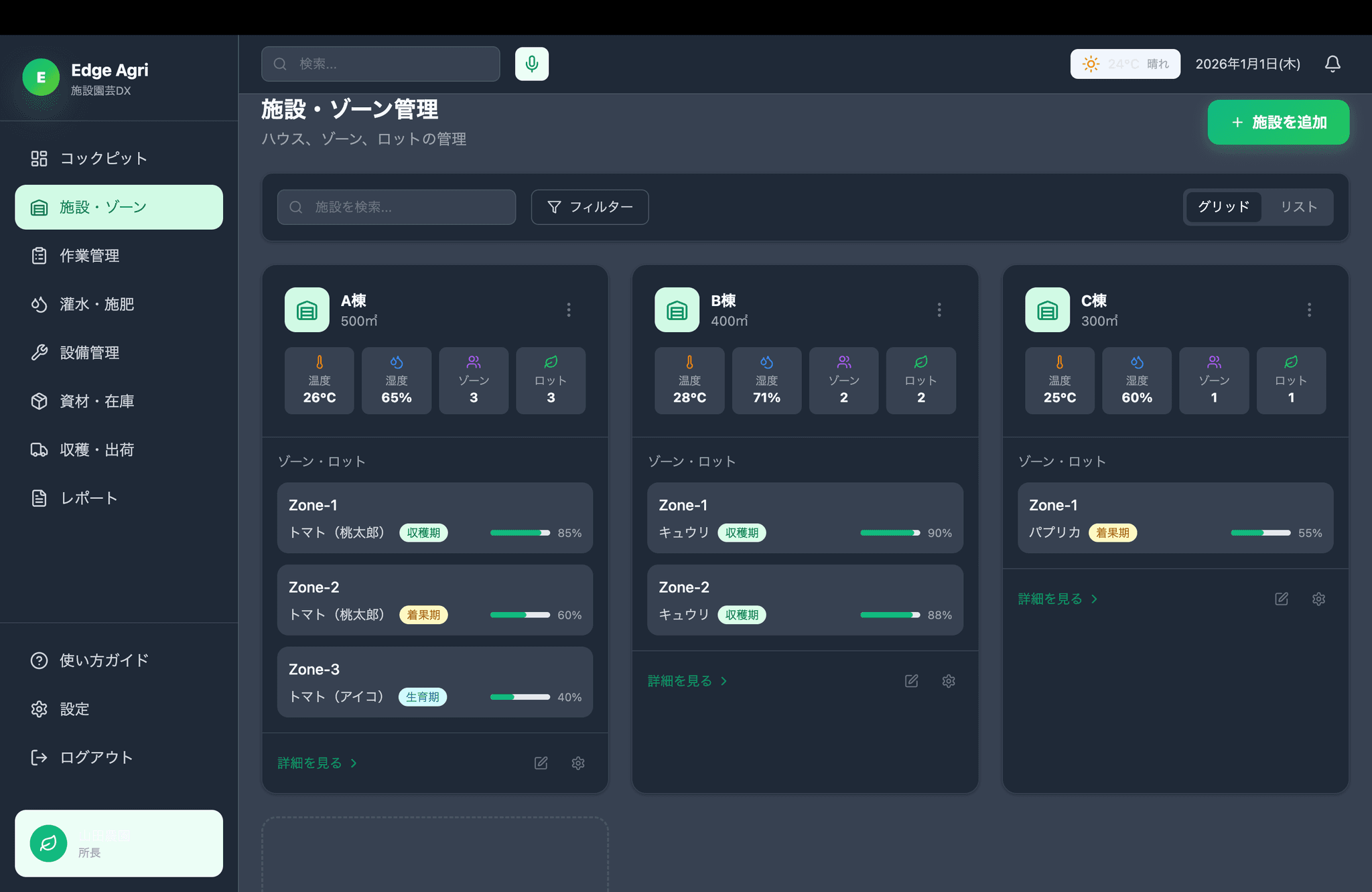 - ハウス/ゾーン/ロット管理による栽培標準化