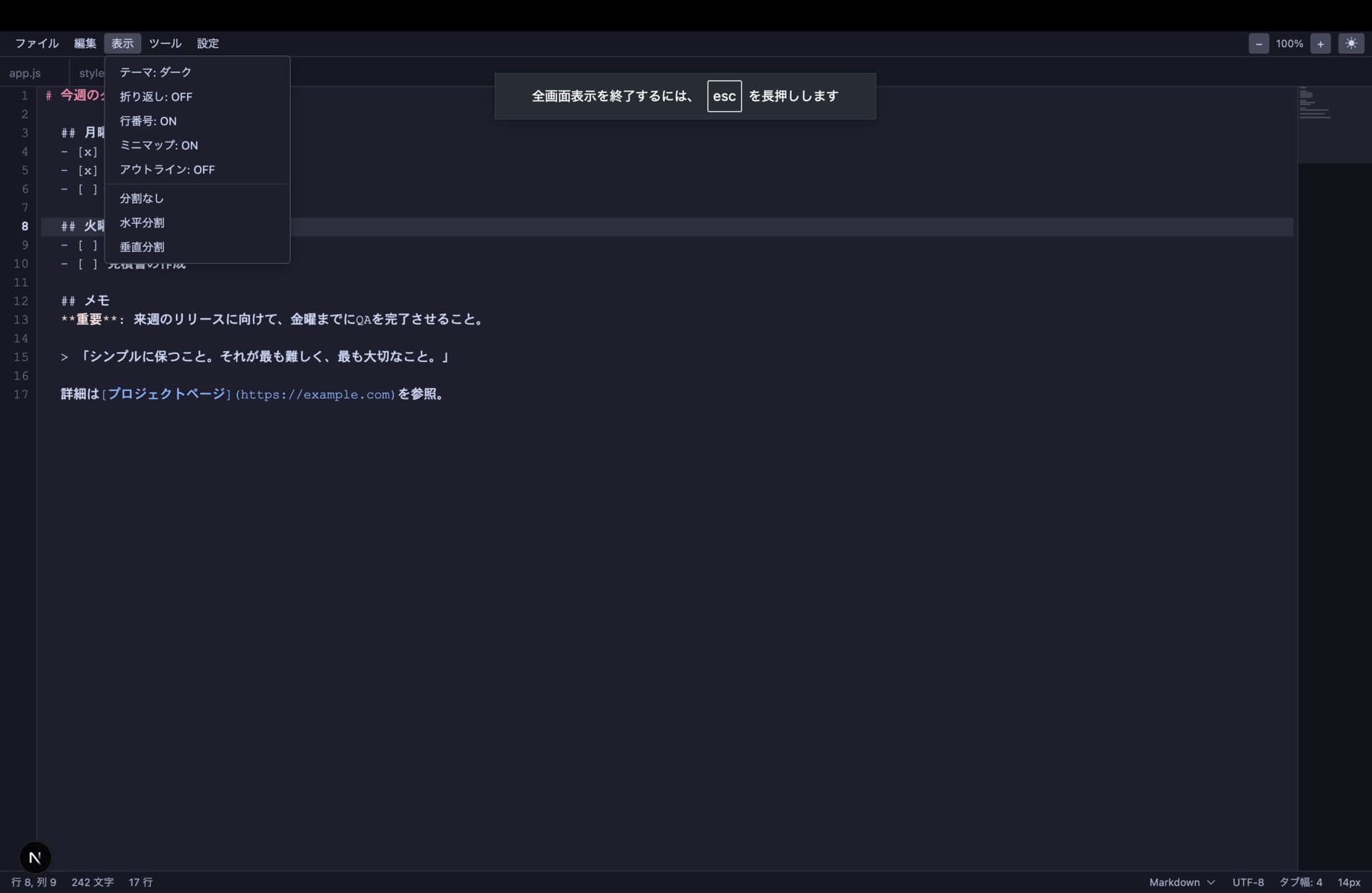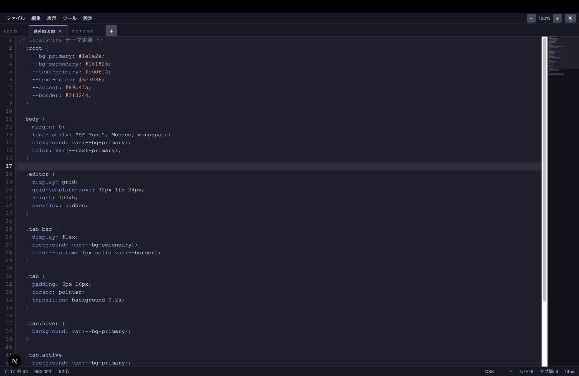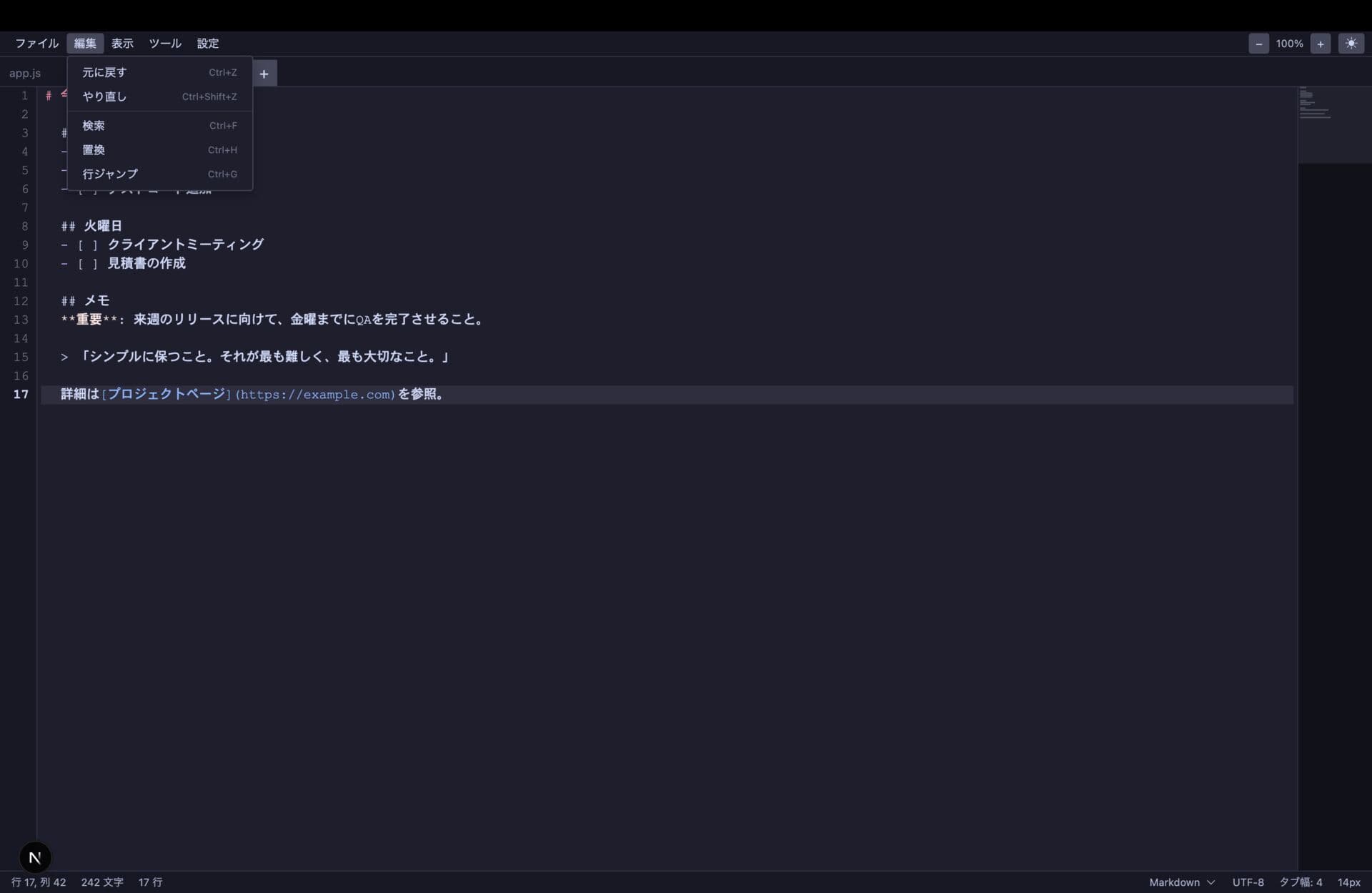 - ステータスバー(行:列、文字数、バイト数、言語、改行コード、エンコーディング、タブ幅)