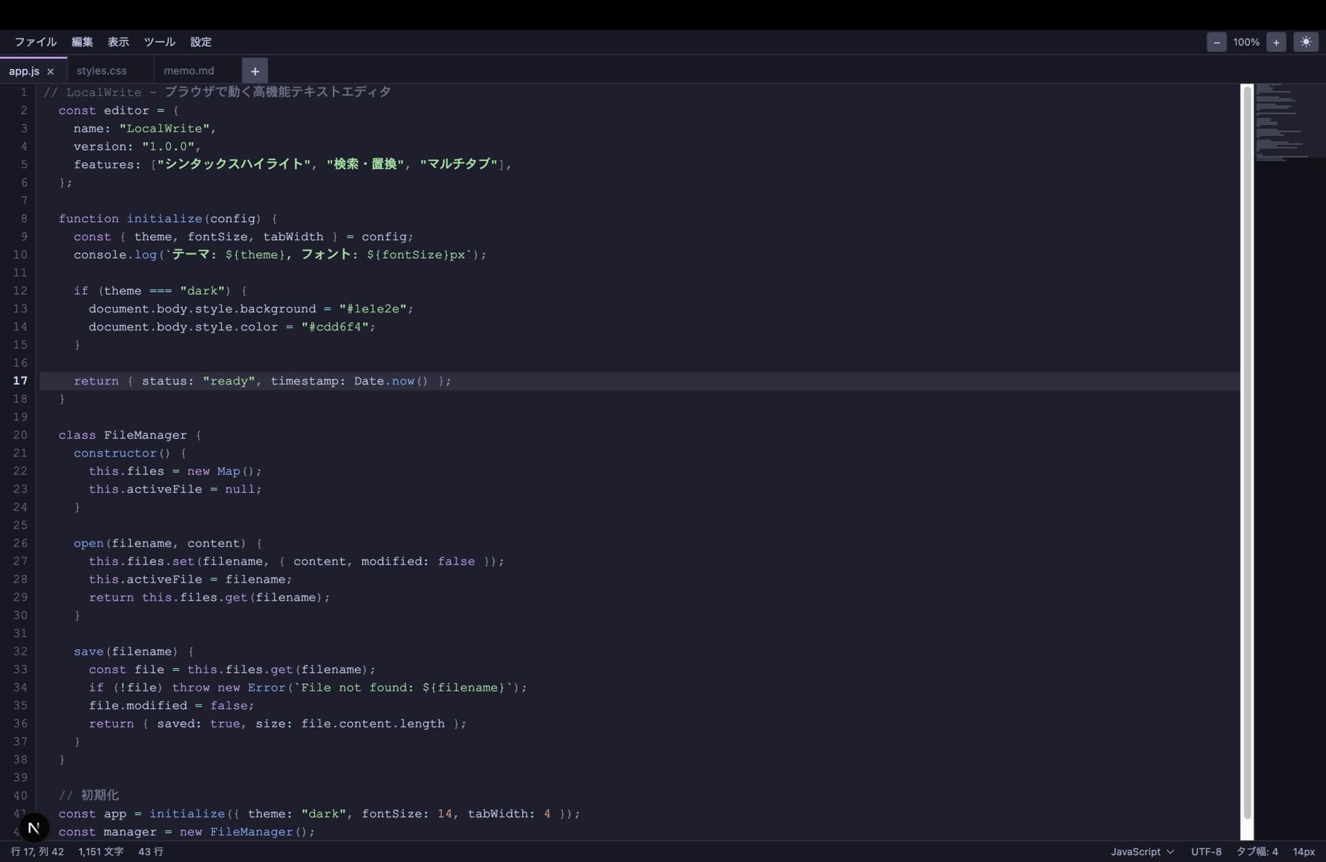 単一の HTML ファイルで構成された完全オフラインのテキストエディタです。外部ライブラリ・フレームワークを一切使用しておらず、すべてスクラッチ実装されています。外部通信・ネットワークアクセスは一切なく、データは localStorage にのみ保存されます。サーバー不要で動作し、ファイルをダブルクリックするだけで使えます。難読化やバックドアの痕跡はなく、セキュリティ上の懸念はほぼありません。
