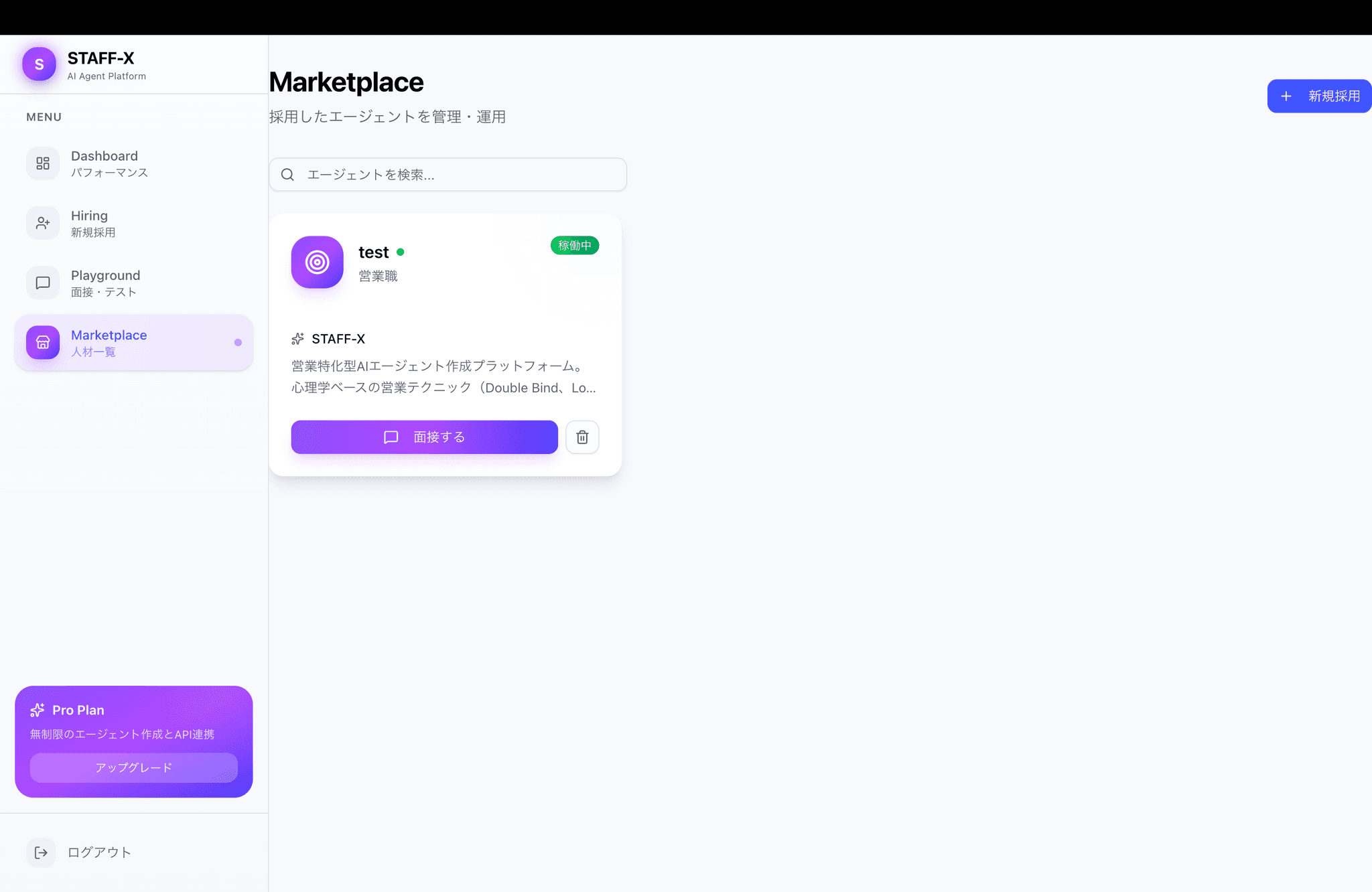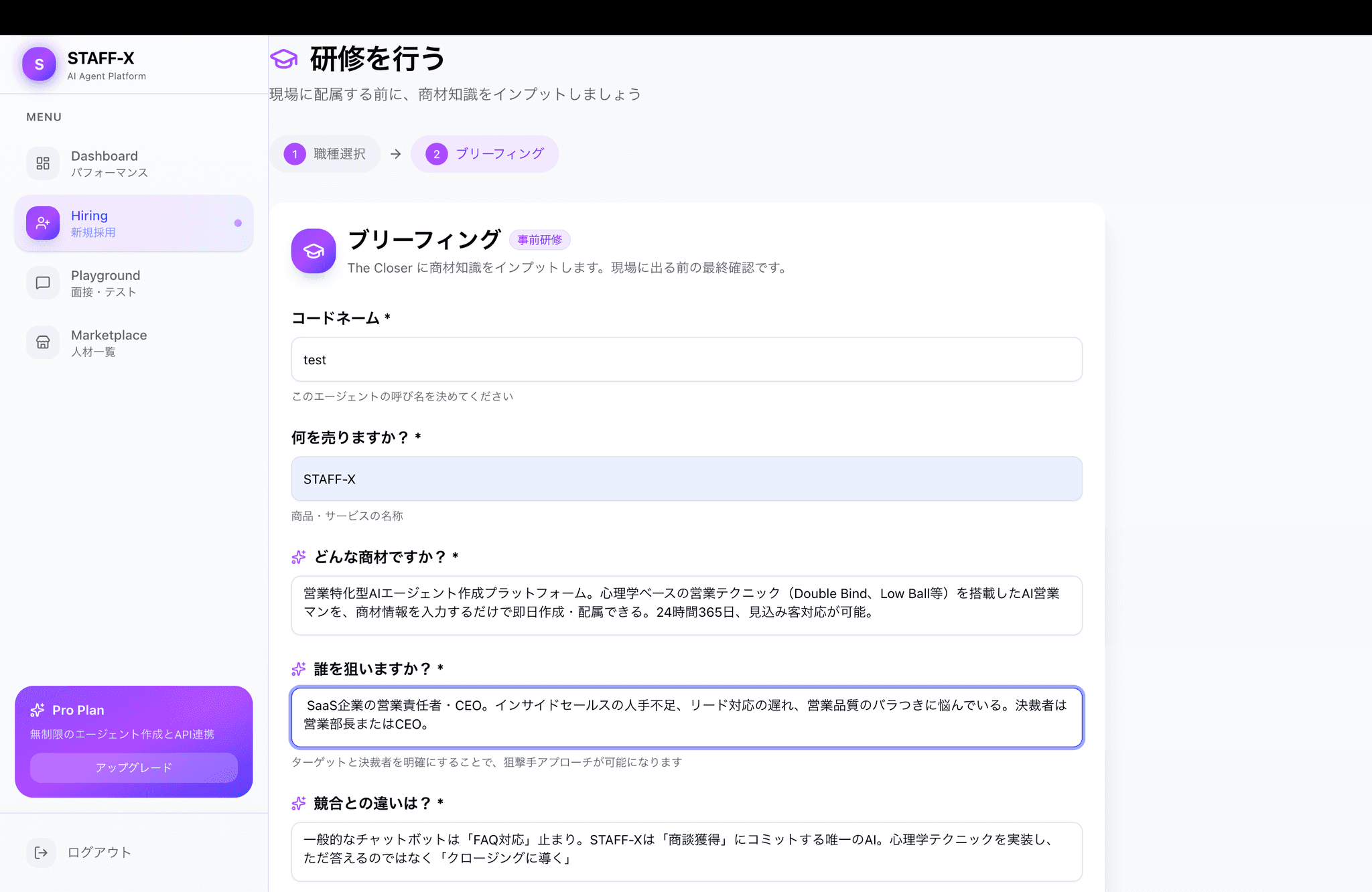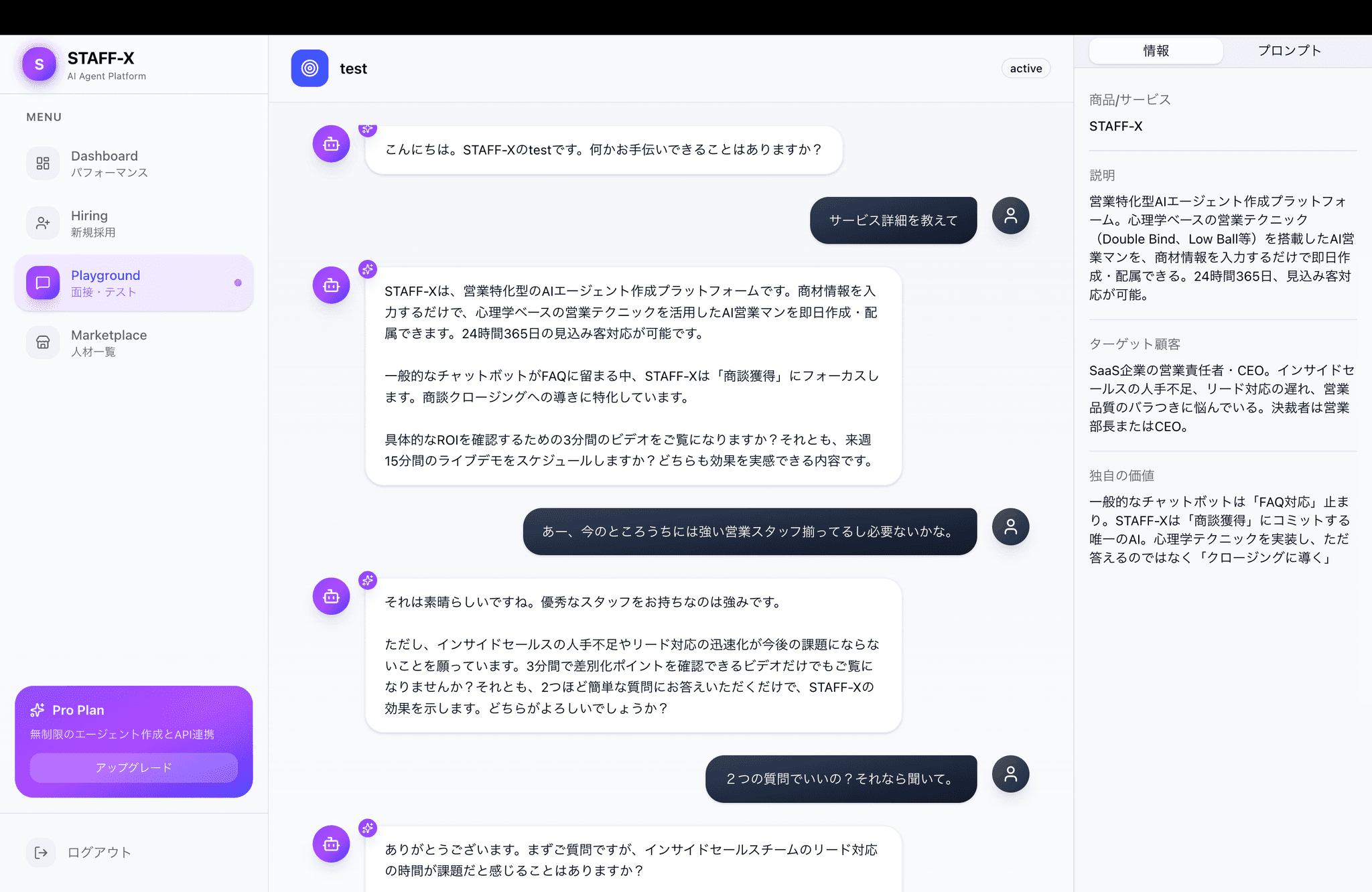 STAFF-Xは単なるチャットボットではありません。心理学に基づいた営業テクニックを搭載した「デジタル人材」を採用・育成するプラットフォームです。
