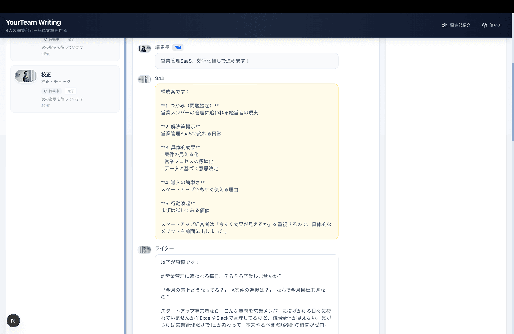 YourTeam Writeは、4人のAI編集チーム(編集長/企画/執筆/校正)が「構成→執筆→校正→納品」まで分業し、
