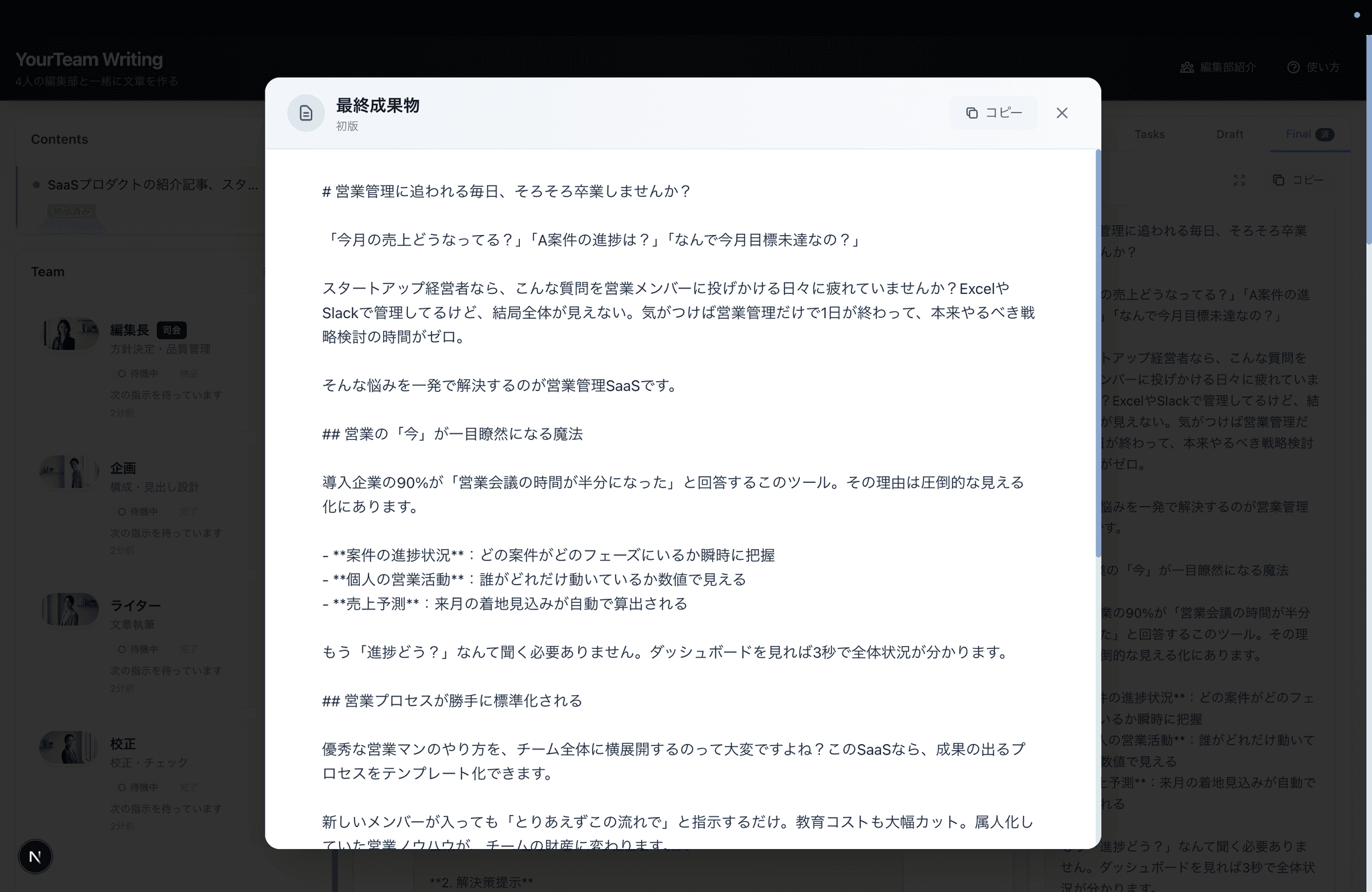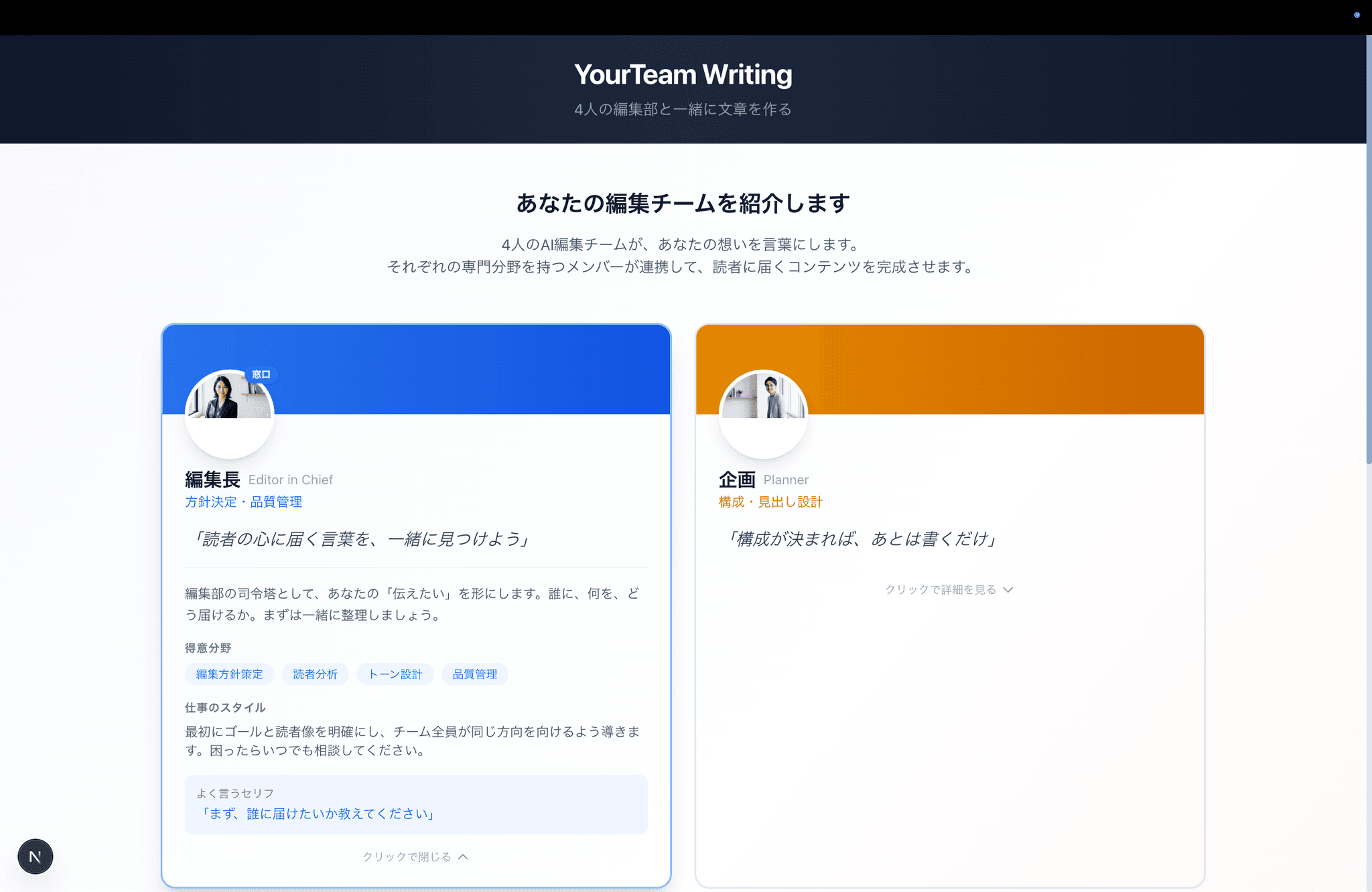 ユーザーは編集長に指示するだけで文章成果物を完成させるコンテンツ制作プロダクトです。