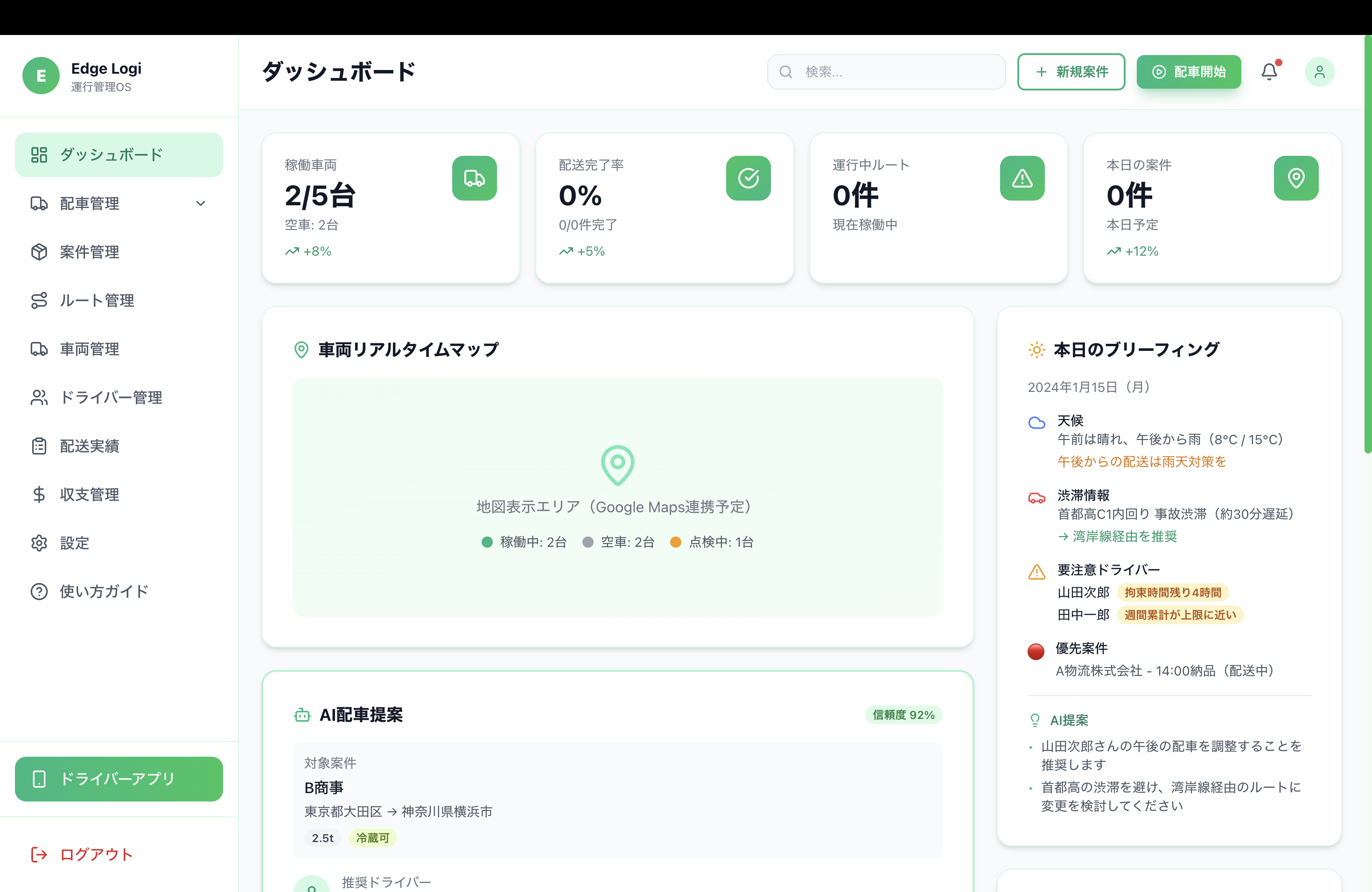 物流・運送業向けDXスイート。配車管理、運行管理、倉庫管理をAIで最適化します。